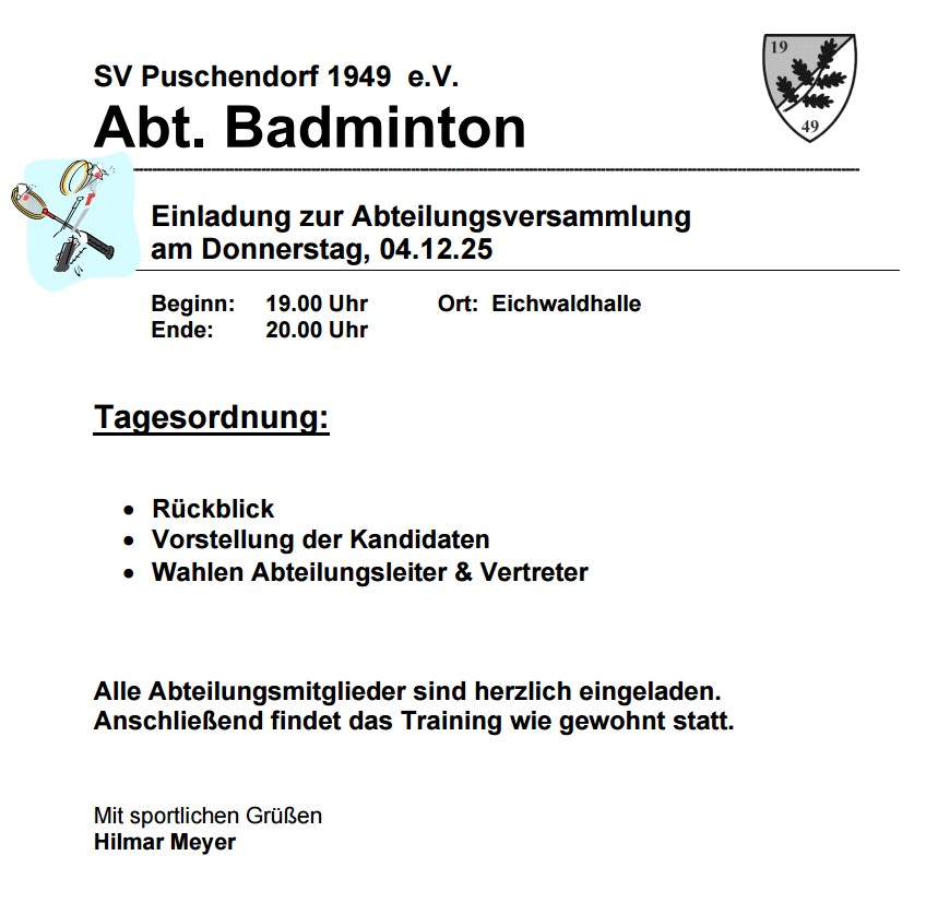 Die Badmintonabteilung ist seit 1998 fester Bestandteil des Puschendorfer Sportvereins. Das Training findet einmal in der Woche in der Puschendorfer Eichwaldhalle, Waldstraße 30 statt, mit dem Ziel einen angenehmen sportlichen Abend zu verbringen. Wir sind Hobbyspieler bei welchen der Spaß aber auch der Wettbewerb nicht zu kurz kommen.