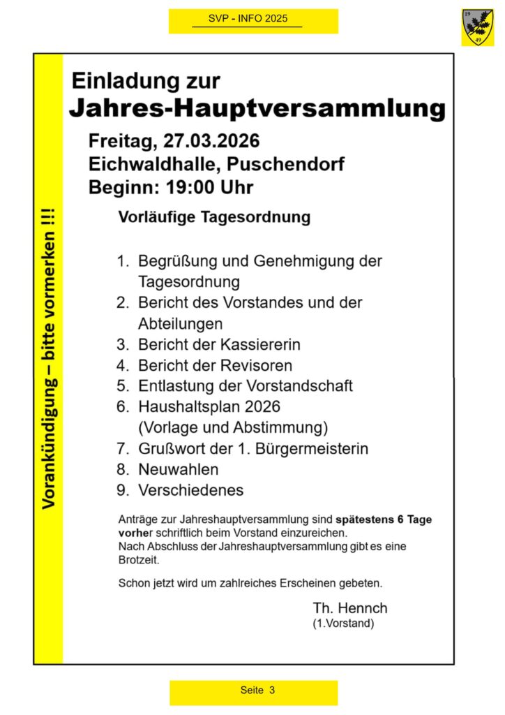 Freitag 27.03.2026 19:00 Uhr Jahreshauptversammlung Sportverein Puschendorf